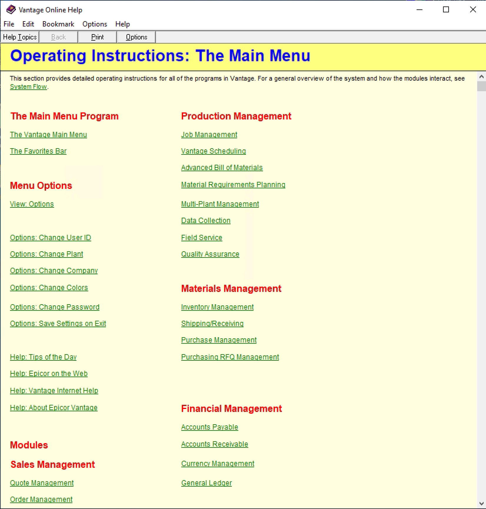 The help menus within Vantage are not directly accessible withing Vantage because Vantage calls the Windows 95 Help System, which was removed from modern version of Windows by Microsoft.
